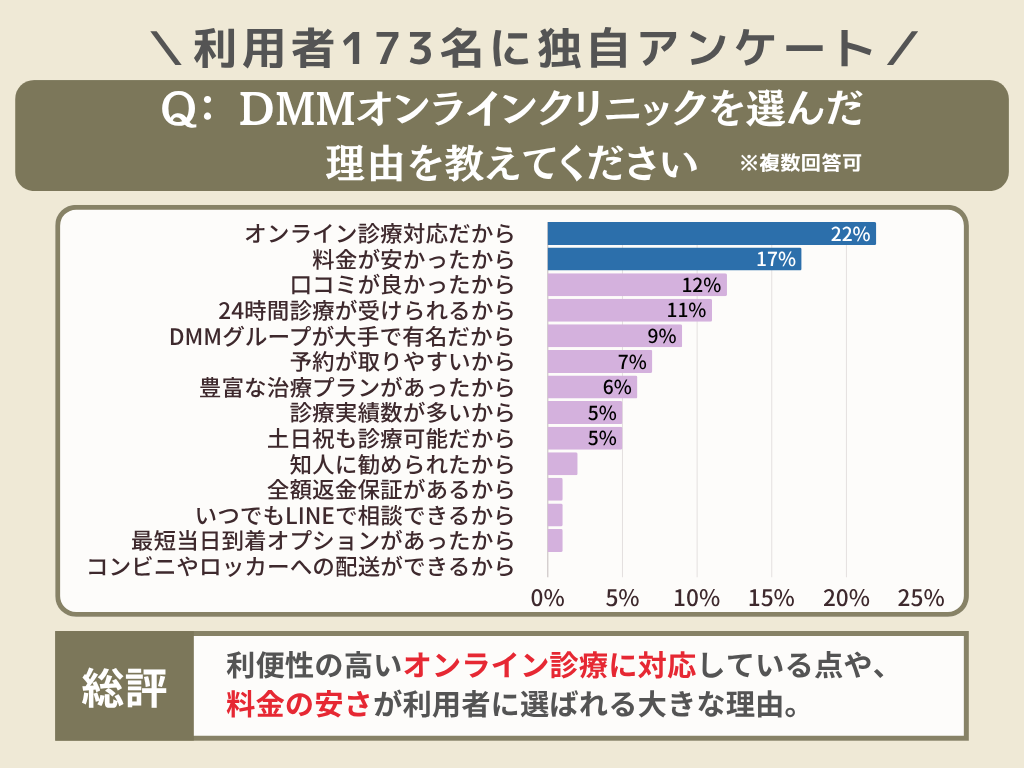 DMMオンラインクリニックは、一般的にどのように評価されているのでしょうか?今回はDMMオンラインクリニックを利用したことがある173名に、「DMMオンラインクリニックを選んだ理由」を聞いてみました。
