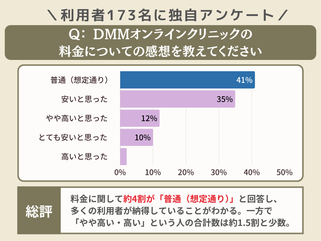 DMMオンラインクリニックの料金については「普通(想定通り)」と「安い」と回答した人が多い結果となり、「やや高い・高い」という回答は両方併せても1.5割程度に留まりました。