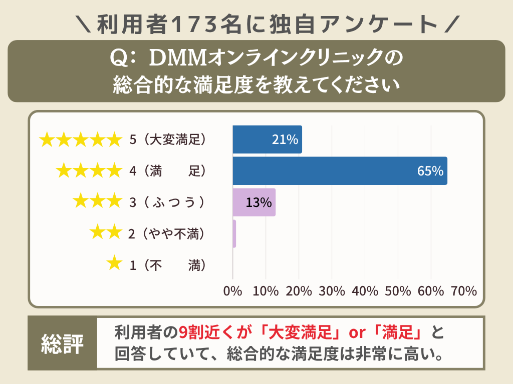 実際にDMMオンラインクリニックを利用した人173名に独自調査をしたところ、最終的な総合満足度として9割近くの方が「大変満足」または「満足」と回答しており、不満という回答はほぼ見られない結果となりました。