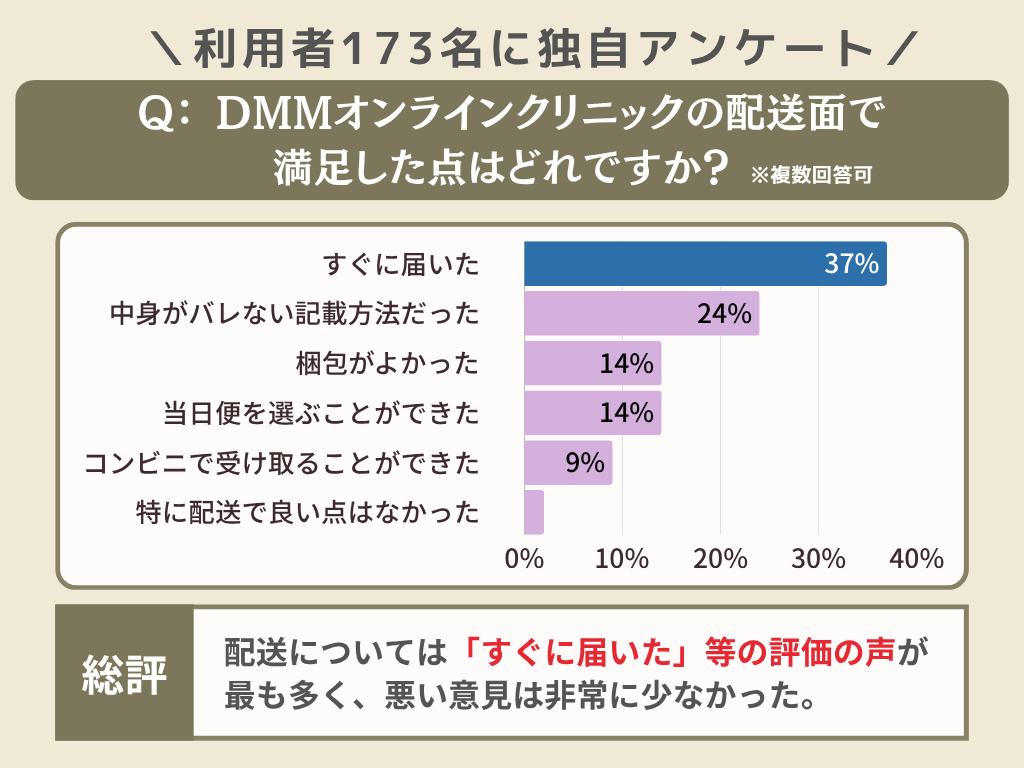 また、DMMオンラインクリニックの評判・口コミの調査として、利用したことがある173名の方にアンケートを実施しましたので参考にして下さいね。(アンケートの結果はこちら)