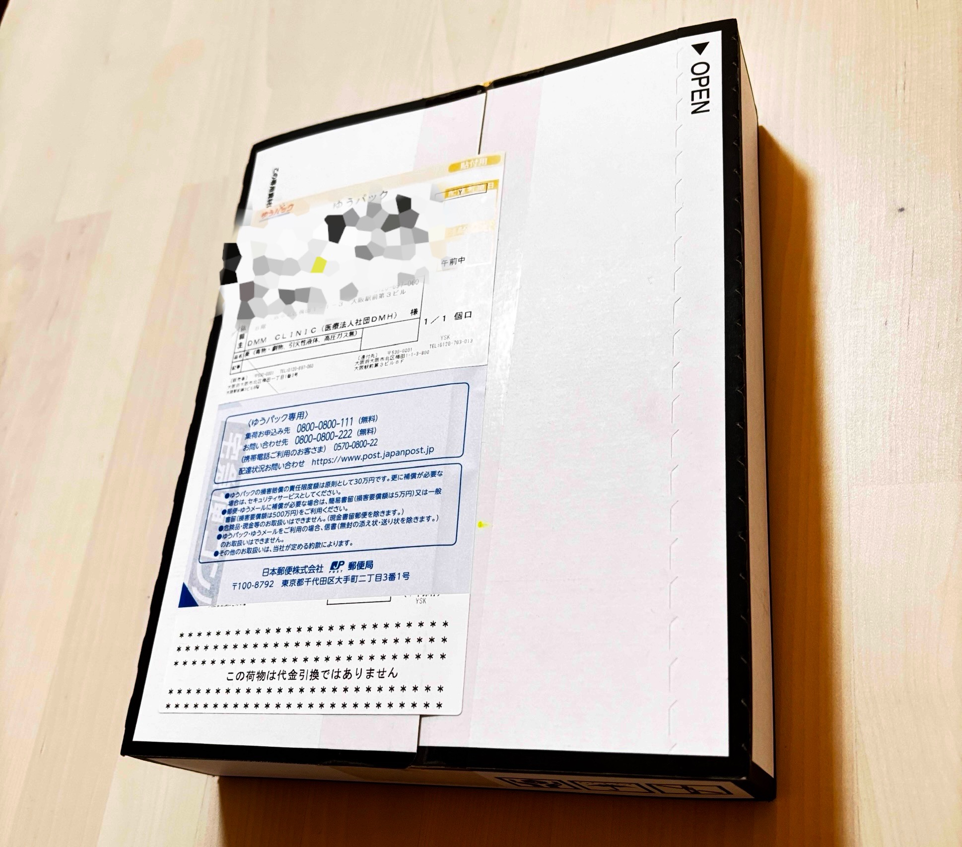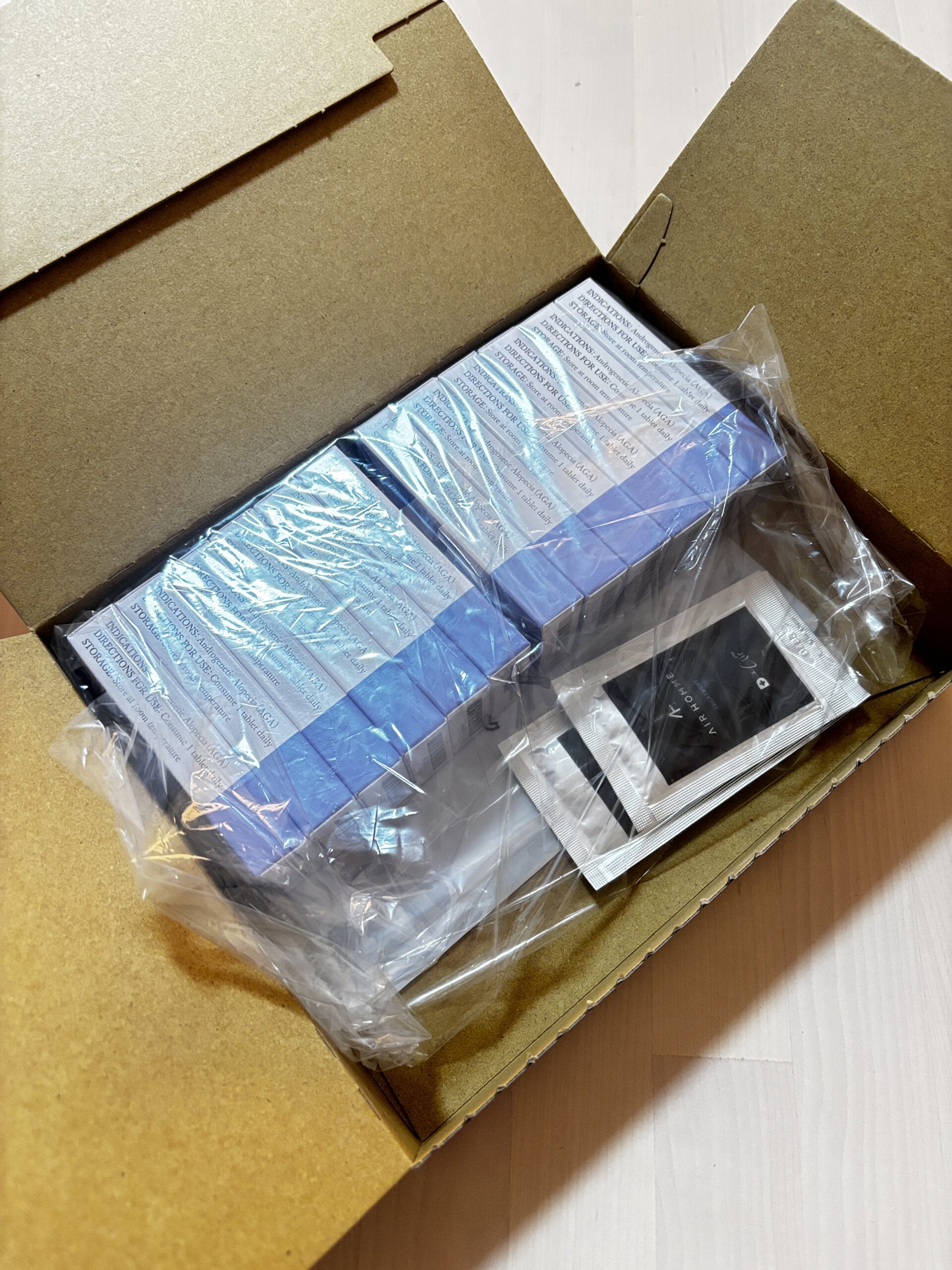 梱包はシンプルな白黒の箱で、パッと見で何の薬を注文したかは一切分からないよう以下のように表記が配慮されていました。