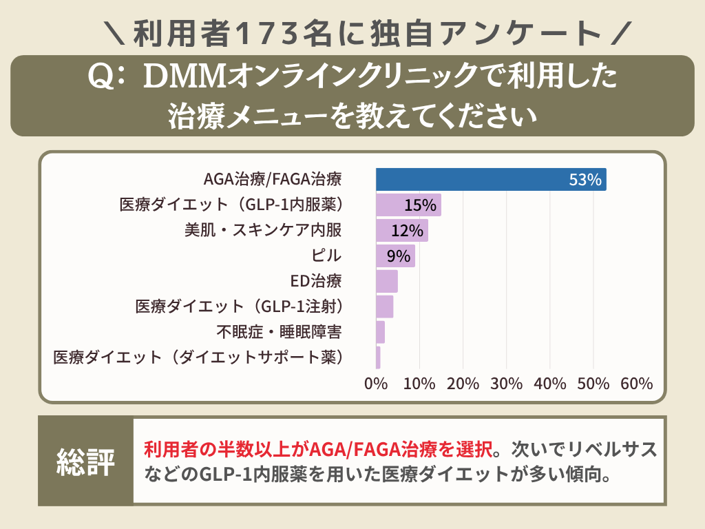 DMMオンラインクリニックを利用したことがある人に独自調査したアンケート結果では、約半数以上の方がAGA治療を利用していることが分かりました。